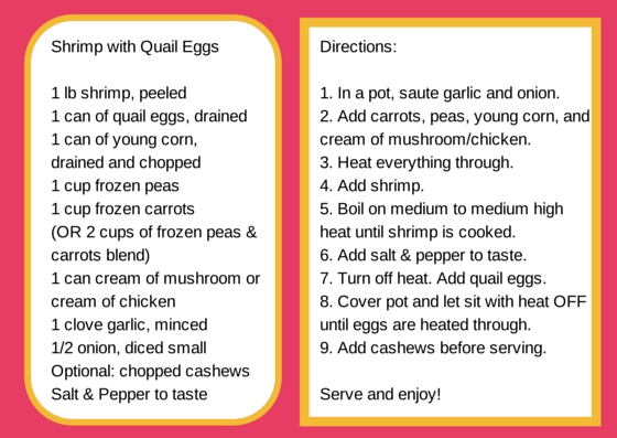 Here it is: Shrimp with Quail Eggs (that’s why they’re not optional :-))